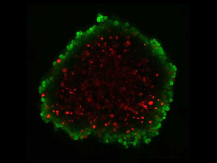 HepG2 球體的共聚焦激光掃描部分。 HepG2 細胞球體使用基于瓊脂糖的液體覆蓋技術生成,并轉移到 µ-Dish 35 mm、高壁生物惰性培養皿。 FDA(綠色)表示外球體層的活細胞。 PI(紅色)標記壞死球體中心內的死細胞。 顯微鏡:蔡司 LSM 710,平面復消色差物鏡 10x/0.45。 比例尺為 200 µm。