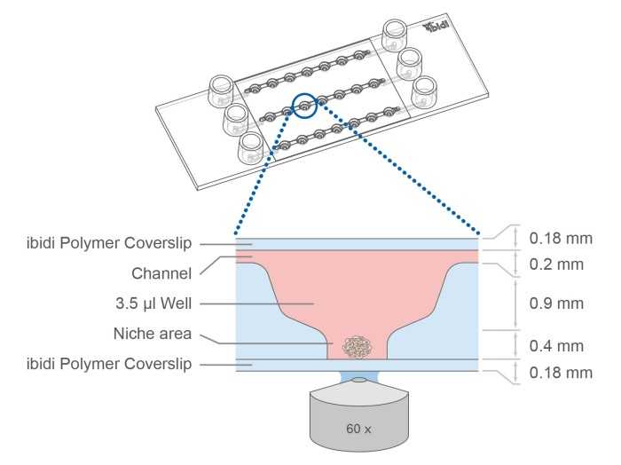 µ-Slide球體灌注是用于培養自由漂浮的3D聚集體的專用流動室。它由3 x 7平底孔組成,這些孔通過上方的通道連接。每個孔形成自己的壁,在此培養標本。